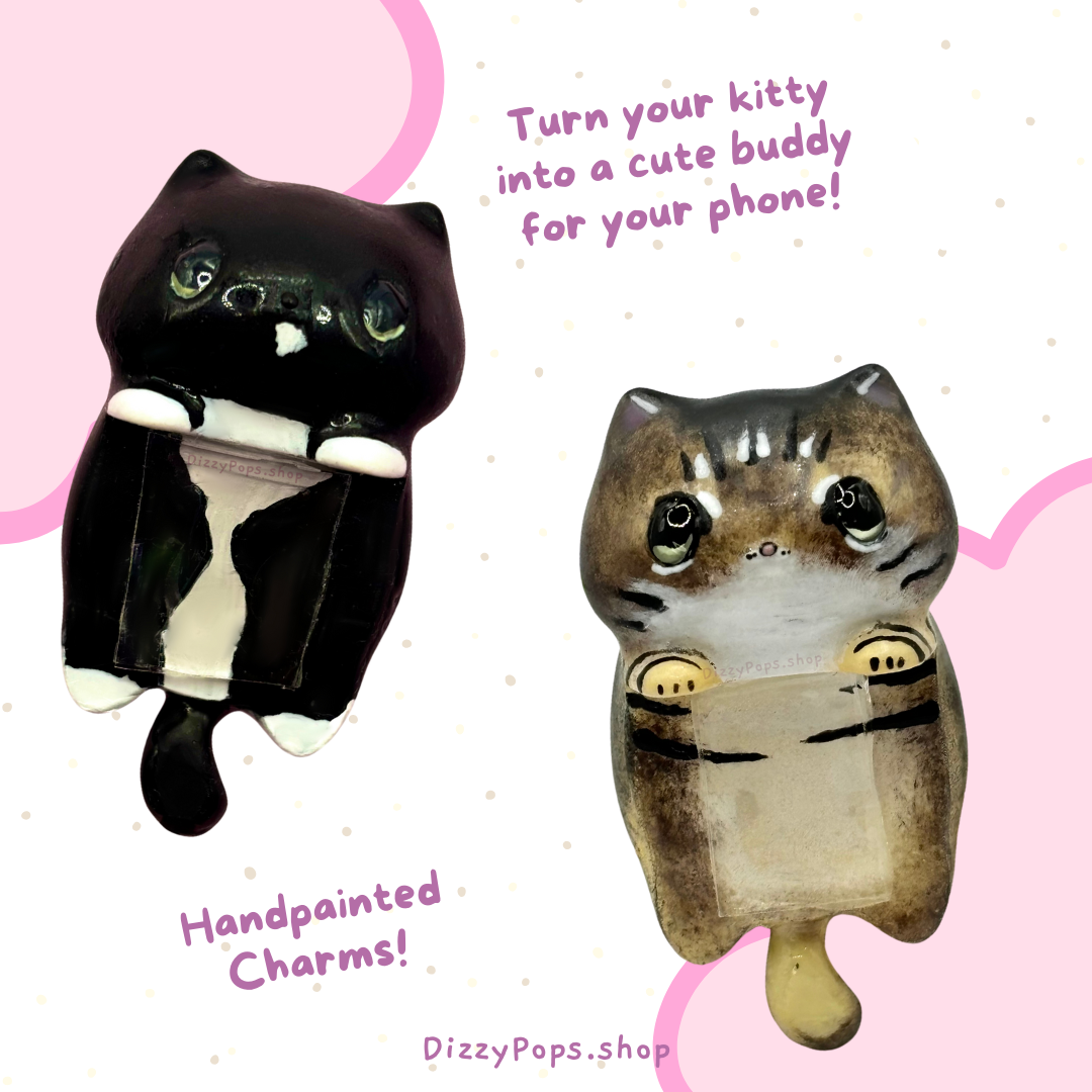 This phone charm is hand painted and each kitty is unique! Due to every charm being hand painted there may be imperfections.